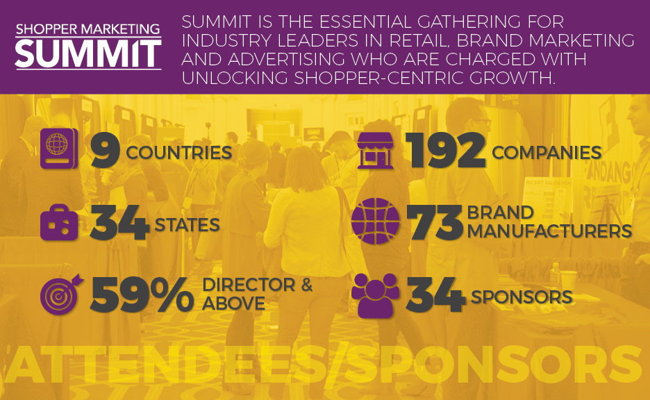 Attendees of the Shoppers Summit include retailers, manufacturers and marketers of consumer products and services, shopper marketing, advertising and promotion agency executives and industry solution providers encompassing digital and mobile technology, P-O-P, retail design, retail execution and shopper insights.