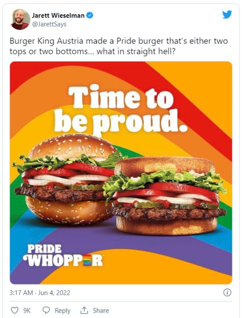 "Burger King Austria made a Pride burger that's either two tops or two bottoms… what in straight hell?" Twitter user, Jarett Wieselman wrote.
