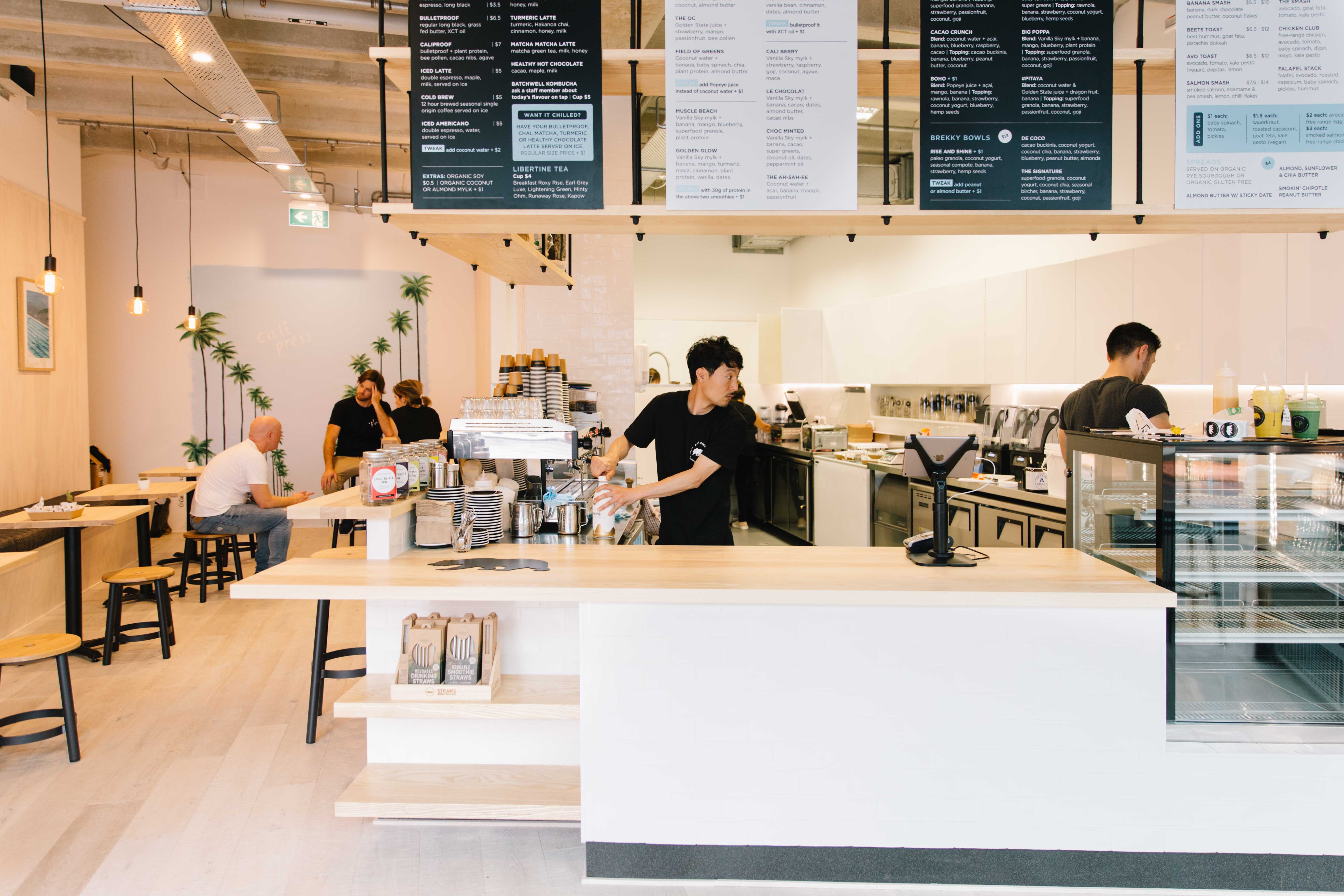The fit out of the Graham St location took six weeks, and the light wood panelling and wide glass windows aim to bring a Californian feel to the inner-city street. The back wall is a mural of the iconic LA palm trees, handpainted by New Zealand-born, LA-based artist TastefullyTash. “It’s great for people who want to take photos, and that’s good for us on social media!”