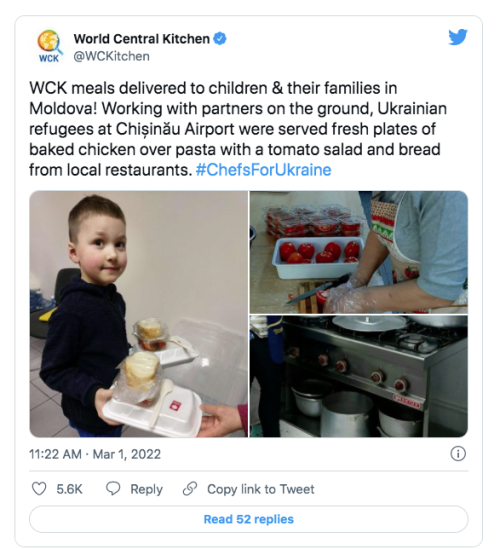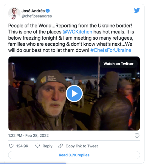 “People of the World… Like you, I am distraught watching Ukraine under attack,” said Andrés in a tweet. “We must come together as a force for good!”