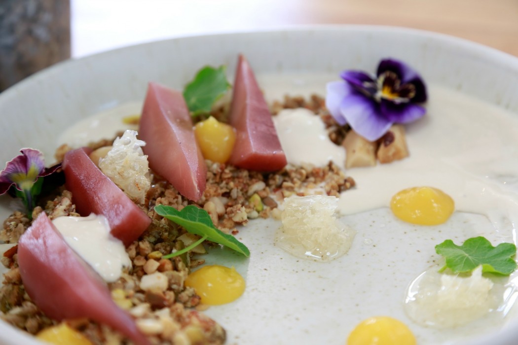 Cornwall Park Café officially opened on 18 May and took a year to build. The Cornwall Park trust board thought of the idea, and the space was chosen because of the beautiful surroundings. Owner Andrew Bell previously owned Andiamo’s in Herne Bay and VGB in Parnell. Paul Izzard designed the fit out, and is also designing the bistro at Cornwall Park which is due to open in December. The team consists of six in the kitchen, and is lead by head chef James Kenny, a Kiwi who previously worked with Gordon Ramsay in London. Kenny designed the menu, which features lots of microherbs taken from the herb garden. The garden is a big feature of the café, with many ingredients grown across in the horticulture garden. It’s also become a popular wedding venue since opening. The theme is focused on a park to table feel.