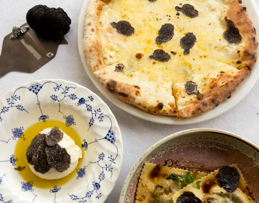 Discovery of Truffle Pizza, fresh black truffle is grated over fior di latte, taleggio, gruyère and gorgonzola.
