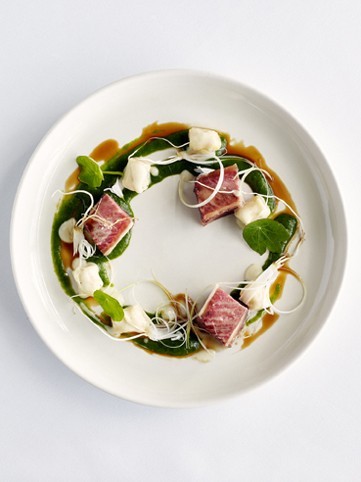 With a signature rounded counter top and pendant lights, the look is now lighter, with pale wood and shades of light grey, blue and gold. Booth seating has been added and guests can sit along the kitchen counter with food served over the pass. With a background in French cuisine and fine dining, newly appointed executive chef and My Kitchen Rules judge Gareth Stewart is at the helm. The menu features Zephyr courgettes stuffed with whipped goat curd and golden raisin vinaigrette, lasagnette with scampi and asparagus, and yellow fin tuna with avocado sorbet and smoked tomatoes. It also features braised octopus and fish bourguignon, eye fillet with ox cheek ravioli, and updated versions of Euro staples including rotisserie chicken and Peking duck pancakes. Sourcing product locally and ethically wherever possible, the fish is line caught, the chicken and eggs are free range and produce comes from a farm in West Auckland.